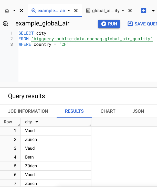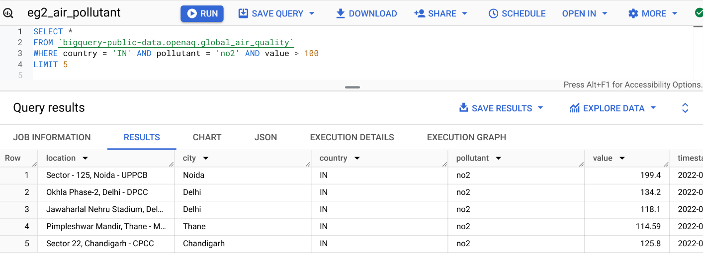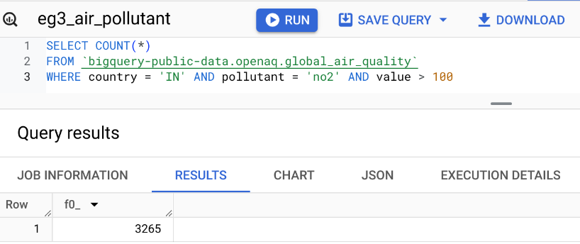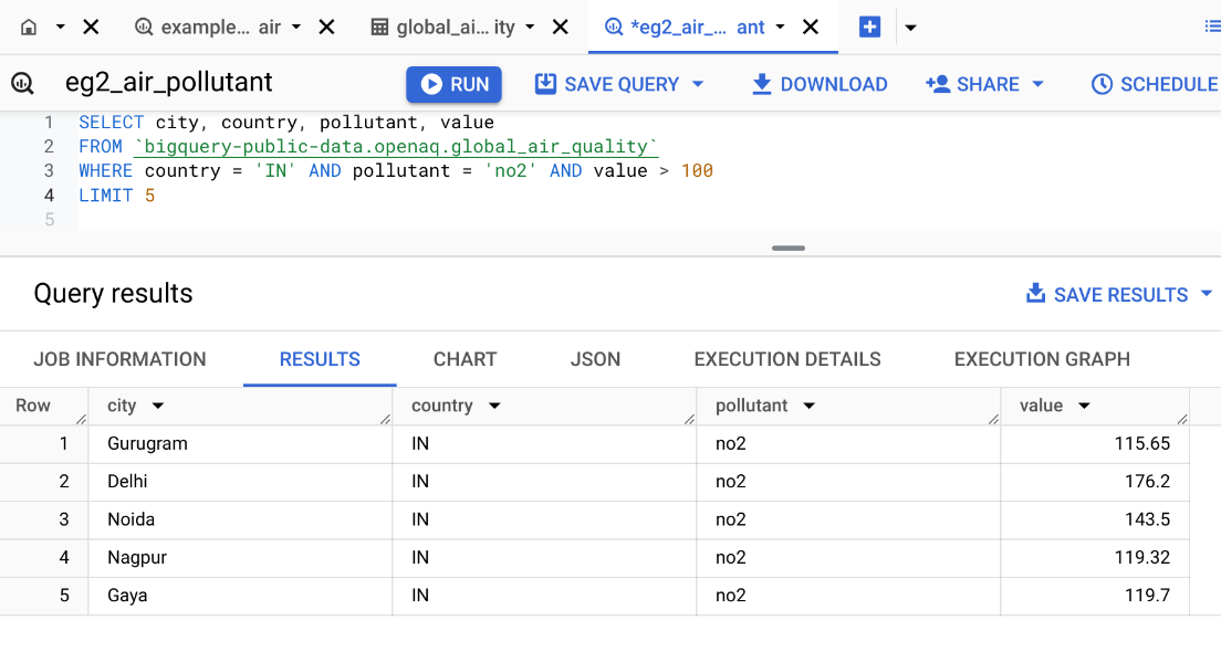 FROM 'bigquery-public-data.openaq.global_air_quality': Indicates the source table where the data is stored. In this case, it’s the global_air_quality table, which is part of the openaq dataset within bigquery-public-data on Google BigQuery.
