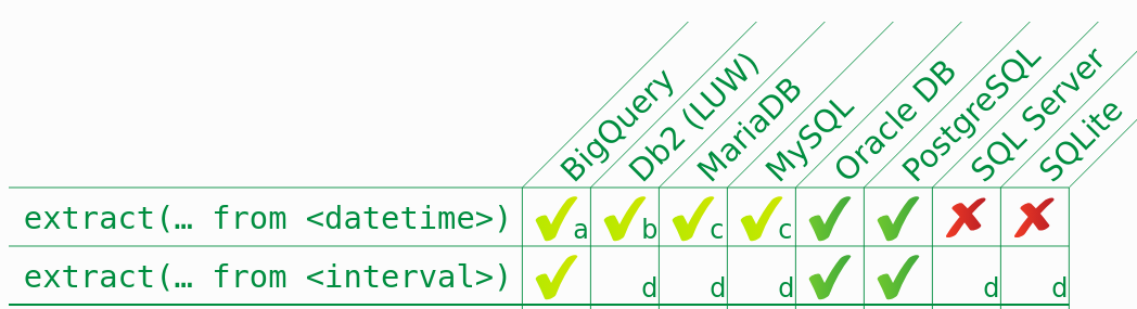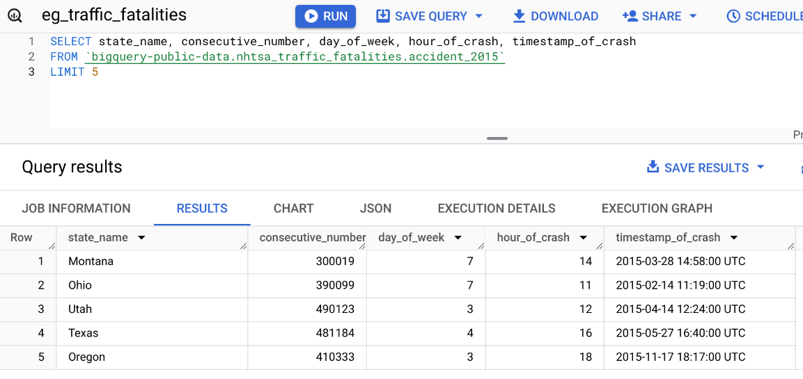 FORMAT_TIMESTAMP, TIMESTAMP and EXTRACT. These might not always be available in all SQL databases. Joins allow merging results from different tables. It is required to specify the “key” linking the tables.