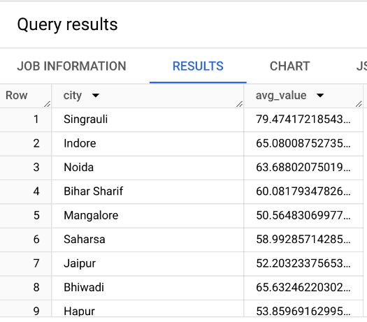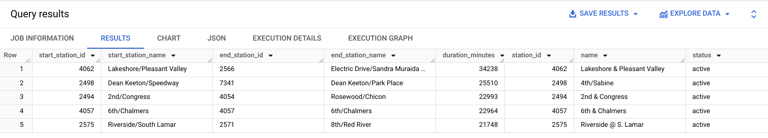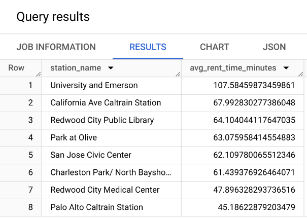 ORDER BY avg_rent_time_minutes DESCJOIN operation to merge the two tables (we will see JOIN in the next slides). We could simply return the station_id instead.bigquery-public-data.san_francisco instead of bigquery-public-data.san_francisco_bikeshare dataset.