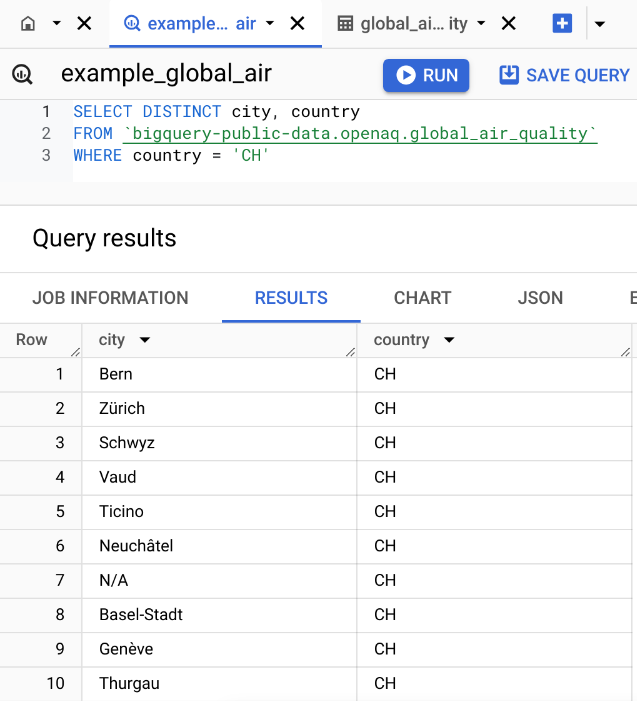 WHERE country = 'CH': This is a filter condition that limits the results to only those rows where the country column has the value ‘CH’ (the country code for Switzerland).