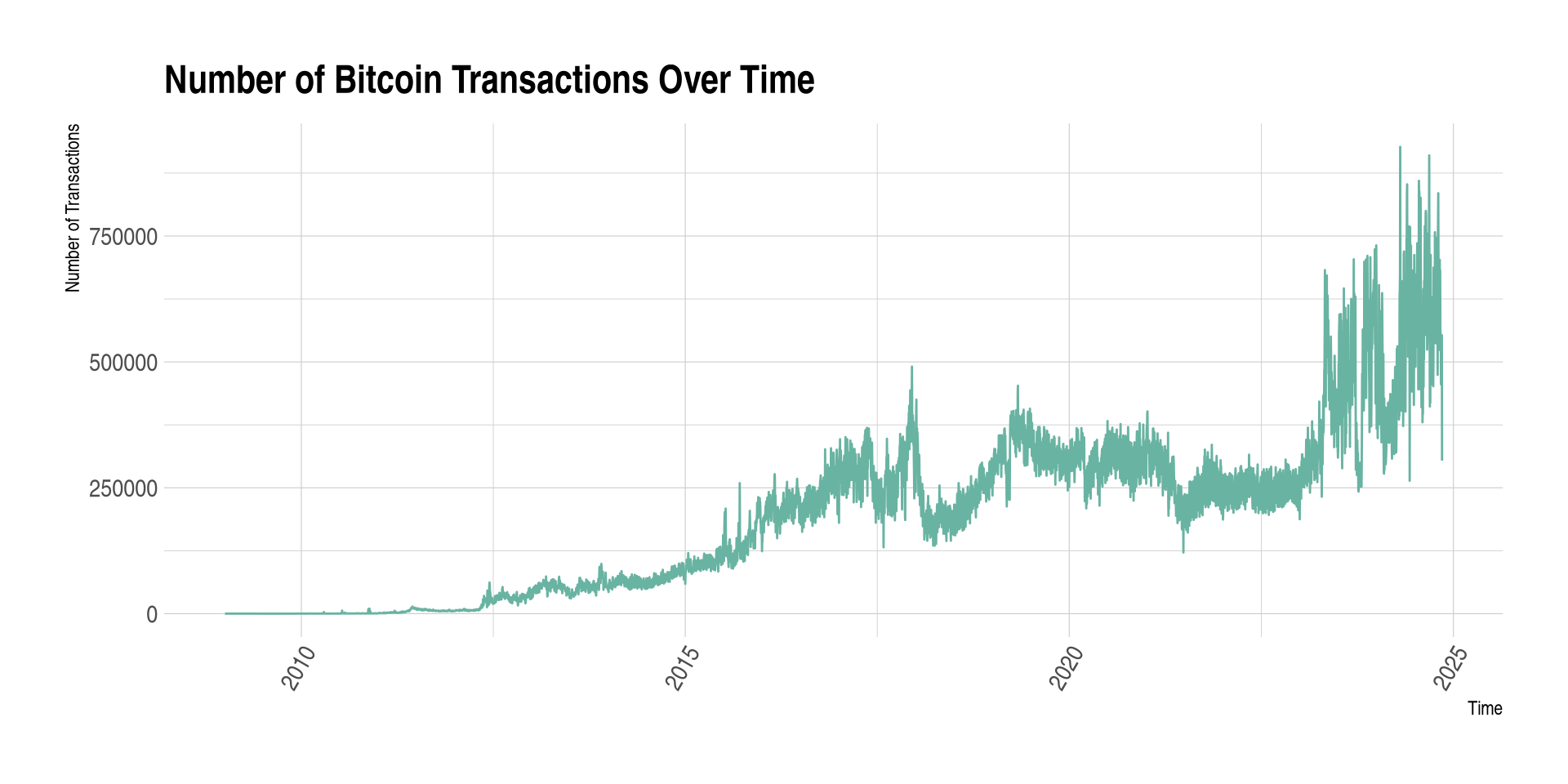 Query: Number of bitcoin transactions per date, sorted by date.