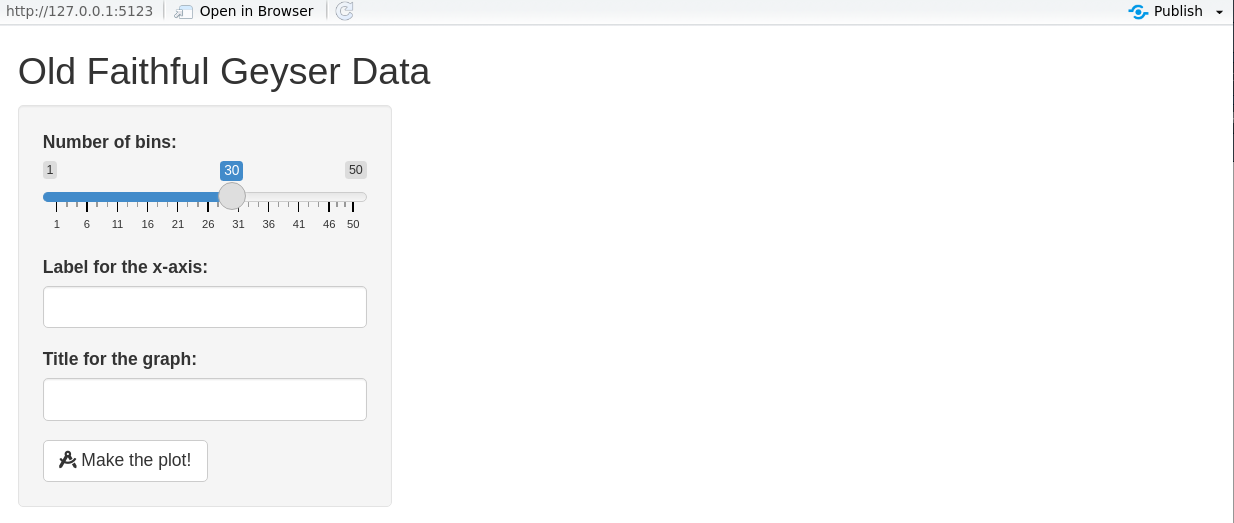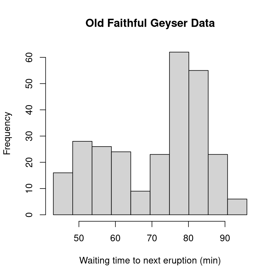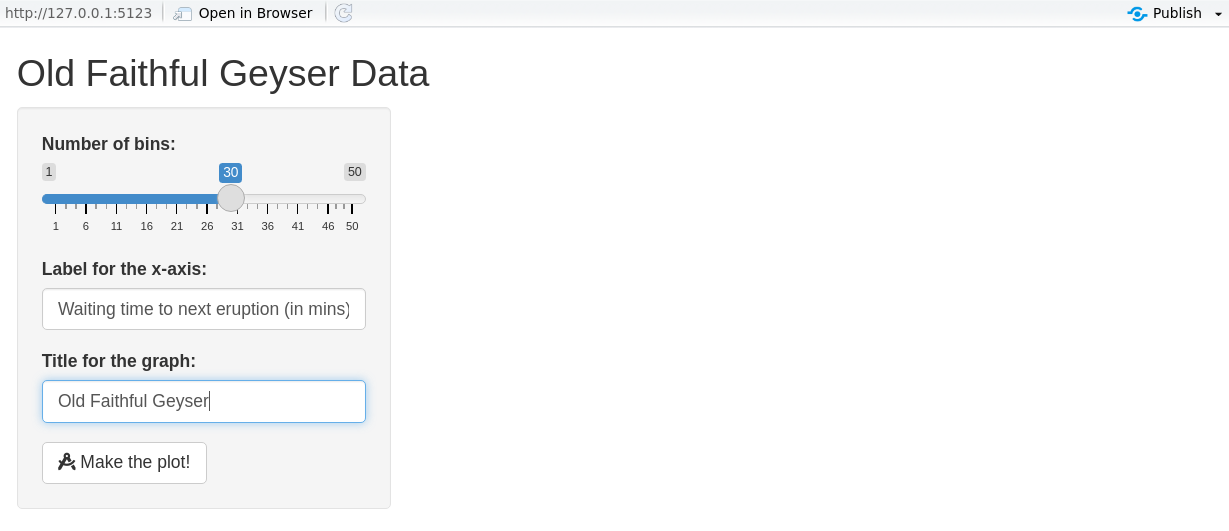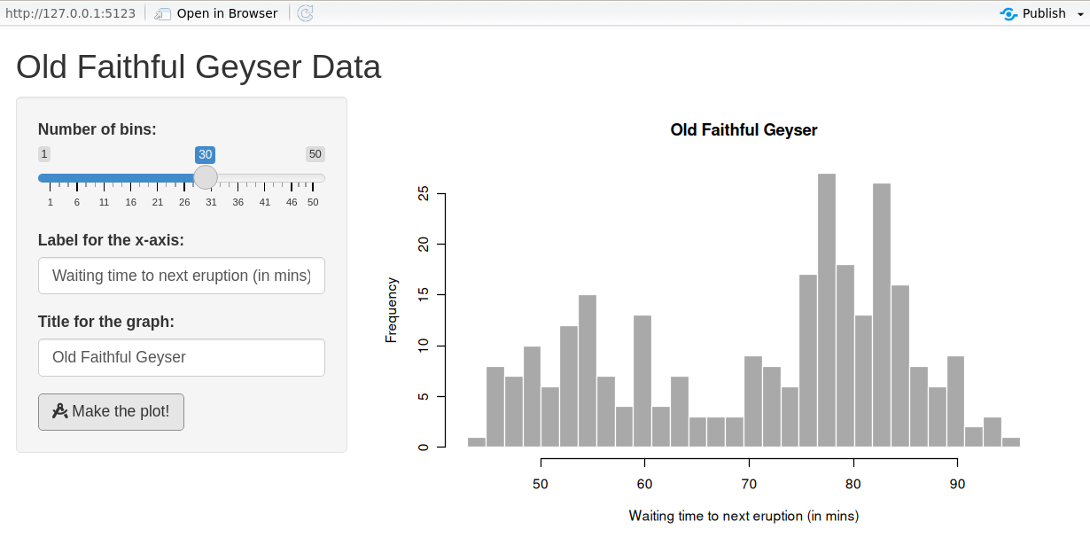 shinyApp(ui, server) (or runApp()).We’ll build a histogram of waiting time between eruptions (faithful).