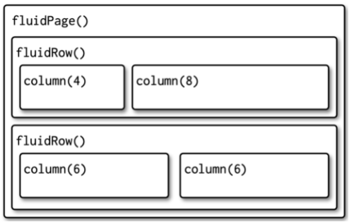 fluidPage(): fixedPage() (fixed width) and fillPage() (full height).sidebarLayout() is built on fluidRow()/column() for finer control.someInput(inputId, …). Access in server as input$inputId.| Function | Description |